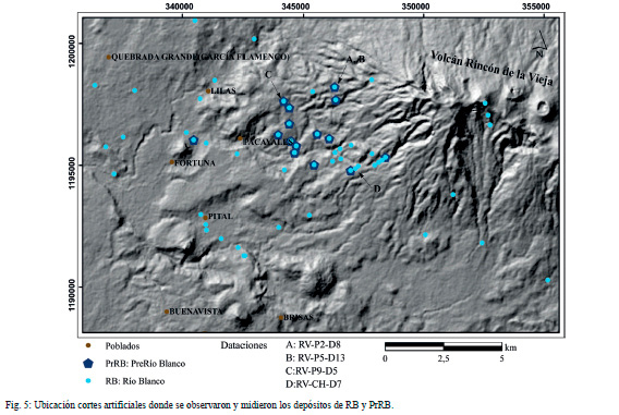 En el presente trabajo se complementó el mapa de isopacas de la capa Río Blanco con las medidas reportadas en la literatura por Kempter (1997) y Barahona et al. (2001). De ahí se escogieron los puntos que daban una lógica a las curvas de las isopacas, complementando los 54 puntos medidos en campos con los 24 de Kempter (1997) y los 25 de Barahona et al. (2001). Además, se designan las abreviaturas RB para la capa Río Blanco, PoRB1 para la capa posterior a Río Blanco, PoRB2 a la segunda capa posterior a Río Blanco y, finalmente, PrRB para el evento previo a Río Blanco, así como CDPd a la corriente de densidad piroclástica diluida.