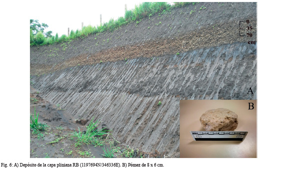 Referente a la edad, Melson (1988) realizó una datación 14C en la base de RB (3490 a.P.), edad que investigadores posteriores (Kempter, 1997; Soto el al., 2003a, 2003b; Alpízar, 2018, entre otros) tomaban como referencia este dato para designar la edad de este depósito y como una capa clave.