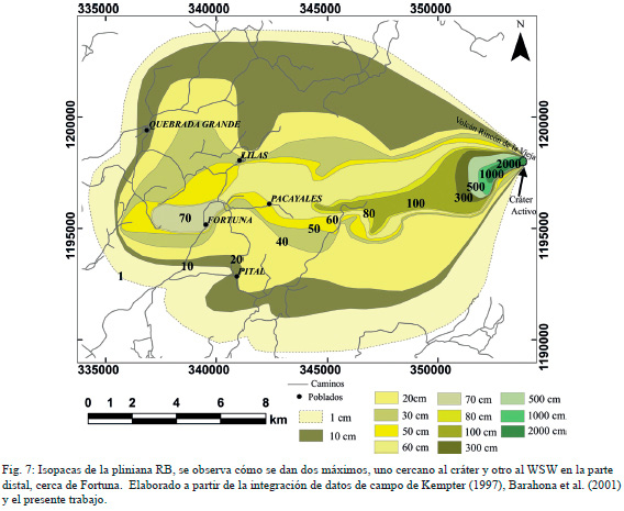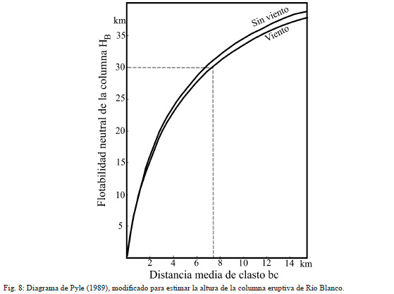El depósito presenta dos máximos en las isopacas; uno en la parte próxima al cráter y otro máximo de 70 cm cerca del caserío de Fortuna, al pie del cerro Fortuna (Fig. 7). La integración de las isopacas muestra líneas muy distorsionadas (no regularmente ovaladas), posiblemente producto de vientos fuentes en varias direcciones (quizás hasta vientos encontrados) al momento de la erupción. Si se utiliza la Fig. 8 (Pyle, 1989) y se considera la distancia media de un clasto de 7 cm encontrado en campo a una distancia de 7,6 km de distancia del cráter (bc= 7,6), al proyectarlo, se obtiene la altura de la columna de 30 km, lo cual, sumado a las características del depósito y a su volumen, concuerda con una erupción pliniana con un VEI 5.