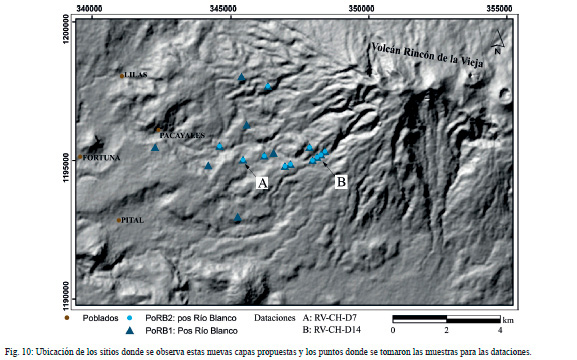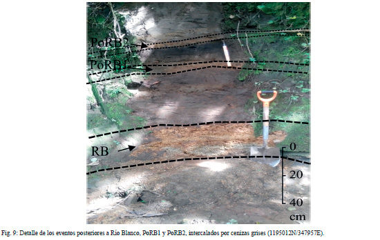 Así, se evidencian varios eventos subplinianos pos-RB. Por ello, se consideró dar seguimiento a estas capas de cenizas y pómez sobre la pliniana de RB, ya que estos eventos son más jóvenes que RB (Fig. 9). Esta secuencia consiste de varias capas de cenizas y niveles de lapilli fino de pómez muy marcados. La primera capa posterior a RB (PoRB1) tiene hasta 17 cm de espesor y capa PoRB2 llega a tener un espesor de hasta 12 cm en un corte de camino cercano al hotel Borinquen, la cual se distribuye 12 km al WSW del cráter activo (Fig. 10). Estas capas fueron datadas en 1040 d. C. y 1650 A. D y lo cual nos indica que hay erupciones más recientes e importantes posteriores a RB, por lo que se puede decir que existen otros eventos explosivos relevantes entre RB y las erupciones históricas del Rincón de la Vieja, aspecto igualmente novedoso dentro de la literatura de este volcán.