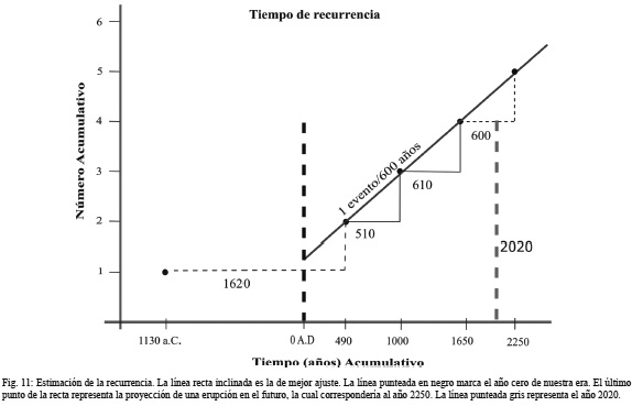 Para los últimos 2000 años, la recurrencia de eventos importantes (VEI > 4) groseramente sería un evento cada 600 años, aproximadamente. La probabilidad de que se presente un evento pliniano o subpliniano a corto plazo, en el caso de mantenerse dicha recurrencia, es muy baja pero no improbable. La geoquímica de los productos históricos, de tipo andesítico más no dacítico, indica que no se están generando magmas más ácidos, al menos por el momento o volumétricamente importantes. De modo especulativo, entonces se podría esperar que la próxima erupción pliniana (VEI 4-5) se dé cerca del año 2250 (Fig. 11).