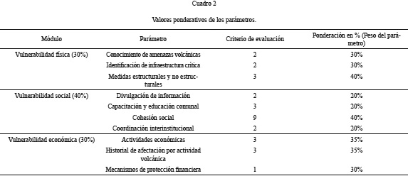 Este indicador evalúa los aspectos físicos, sociales y económicos ante las amenazas de origen volcánico, así como los procesos de gestión que se han implementado en el área de estudio, por parte de los actores institucionales y la población civil, para reducir sus condiciones de riesgo. El indicador se compone de tres módulos: vulnerabilidad física, vulnerabilidad social y vulnerabilidad económica, los cuales están subdivididos en parámetros, y estos a su vez, en criterios de evaluación (Cuadro 2).