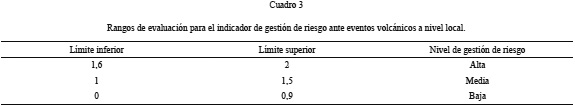 Posterior a ello, se utilizó un rango de evaluación para el Indicador de riesgo ante eventos volcánicos a nivel local para su valoración cualitativa (Cuadro 3).