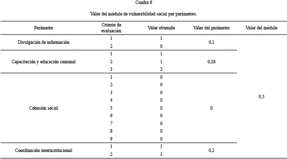 De acuerdo con la información expuesta en cada uno de los parámetros citados anteriormente, se determina que el módulo de vulnerabilidad social obtiene un valor de 0,5, lo cual corresponde a una vulnerabilidad baja (Cuadro 6).