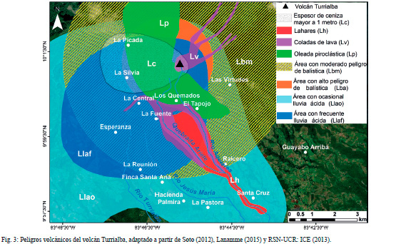Soto, G. (2012). Preparación de mapas de peligros volcánicos y restricción de uso de la tierra en el volcán Turrialba. Mapa de peligros volcánicos del volcán Turrialba. Comisión Nacional de Riesgos y Prevención de Emergencias. Recuperado de: http://rsn.ucr.ac.cr/images/Noticias/2012_11/Informe_final_peligros_VTurrialba-Fundevi_a_CNE_2012.pdf