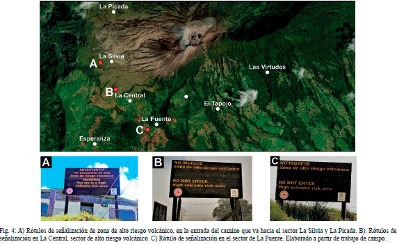 Esta información ha facilitado delimitar las áreas de acceso al volcán e identificar las actividades agropecuarias en sitios de amenaza (lluvia ácida, caída de balística, lahares y caída de ceniza). Asimismo, ha permitido la construcción de módulos de estabulación (invernaderos para el ganado) en áreas estratégicas. El trabajo de identificar las actividades agropecuarias en sitios de amenaza y la construcción de los módulos de estabulación, ha sido una labor conjunta entre la Agencia de Extensión Agropecuaria de Turrialba, CNE y el gobierno local. Otro dato importante por destacar es que las áreas de mayor amenaza, denominadas por la CNE áreas de medio y alto riesgo volcánico (anillos uno y dos), se encuentran debidamente señalizadas, mediante rótulos (Figura 4), para conocimiento de la población local y visitante. Existen en total 14 rótulos distribuidos en las rutas de acceso, entre los dos y cinco kilómetros alrededor del volcán, labor que ha sido asumida por la CNE.