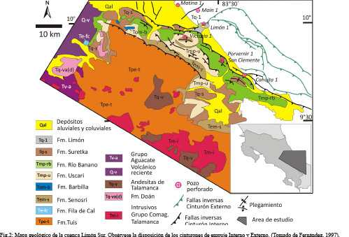 Seguidamente la cuenca de Limón Sur, continuó rellenándose a partir de la progradación de abanicos aluviales, representados por conglomerados y areniscas de la Formación Suretka del Plioceno y Pleistoceno (Bottazzi et al., 1994; Fernández, 1987) como respuesta al levantamiento del retropaís (Cordillera de Talamanca) asociado a la etapa tectónica compresiva iniciada a partir del tope del Mioceno superior (D4 sensu Gursky, 1988) y al vulcanismo post intrusivo del Plioceno y Pleistoceno (Alvarado y Gans, 2012).