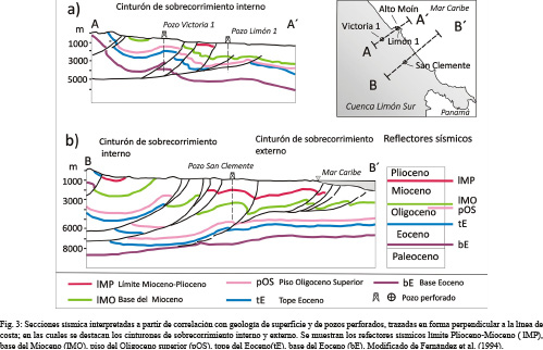 La identificación de horizontes sísmicos calibrados con perforaciones estratigráficas (Barboza, Fernández, Calvo, Laurito, y Morales, 1987) constituye un elemento adicional para dar sustento a esta correlación de secuencias tectono–sedimentarias.