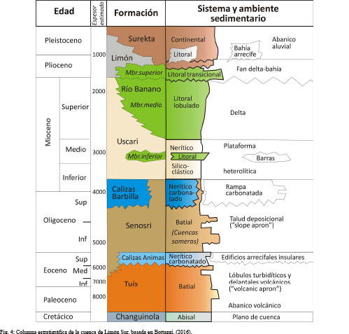 La estratigrafía de la cuenca de Limón Sur (Figs. 2 y 4), según Bottazzi (2016) está basada en Sprechmann, Astorga, Calvo y Fernandez, (1994), y se transcribe brevemente de la siguiente manera: