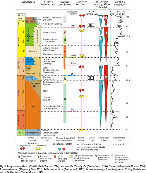Adicionalmente se toma en cuenta la relación con las fases compresivas definidas por Gursky (1988) y el dominio tectónico asignado por Bottazzi (2016), así como los eventos volcánicos definidos en la historia magmática de Talamanca (Alvarado y Gans, 2012).