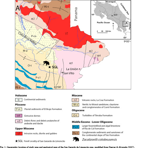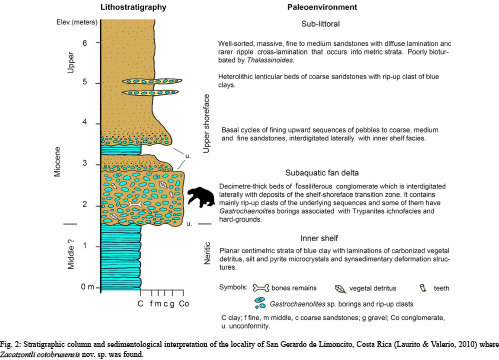 The remains of the new species of Megalonychidae described in this article, come from an outcrop of conglomerates in the vicinity of the town of San Gerardo de Limoncito, Coto Brus Valley, Costa Rica (Fig. 1). This sedimentary unit is located at the top of the Curré Formation and these conglomeratic lenses have been interpreted as part of a subaquatic fan delta facies, indicating the transition of typical facies indicative of inner neritic platforms to sub-littoral and estuarine coastal environments (Fig. 2) (see Laurito & Valerio, 2010 and Rincón, Valerio & Laurito, 2020 for a more detailed description of the geology).