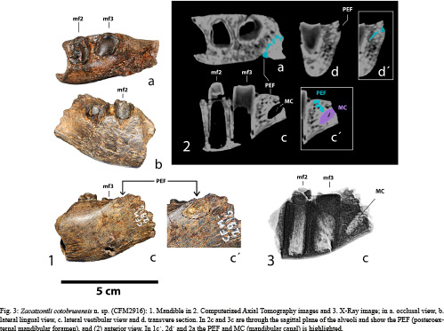 In Zacatzontli cotobrusensis the bulge formed by the lateral expansion of the horizontal ramus is at the level of mf2 but is less developed, so differs from Z. tecolotlanensis where that bulge is very well developed.
