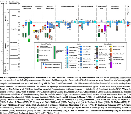 The specimen of Zacatzontli cotobrusensis was recovered from the same area as two other xenarthrans, the megathere, Sibotherium ka and the pampathere Scirrotherium antelucanus. These deposits have been dated using on 87Sr/86Sr as 5.80 ±- 0.60/-0.80 Ma, which is also considered to be early late Hemphillian (Late Miocene). This age assignment is also supported by the presence of Calippus hondurensis, Dinohippus mexicanus, and Protohippus gidleyi. Based on the strontium dates and associated fauna from San Gerardo de Limoncito, the Costa Rica stratigraphic sequence is also considered to be early late Hemphillian (Hh3) (Valerio, 2010). Including the first-appearance datum (FAD) and the biochrons of the camel, Hemiauchenia vera, and the peccaries, Protherohyus brachydontus and Prosthennops serus, all of the faunal elements from San Gerardo de Limoncito indicate a Hh3 age and a strong faunal affinity with the localities of La Hacienda and Santa María, Mexico, where Zacatzontli tecolotlanensis was found, especially with those taxa whose stratigraphic range extends later and with taxa that have a younger range such as Dinohippus mexicanus, Hemiauchenia vera and Protherohyus brachydontus, but not with taxa with earlier ranges of appearance such as Calippus hondurensis (see Fig. 6 ).