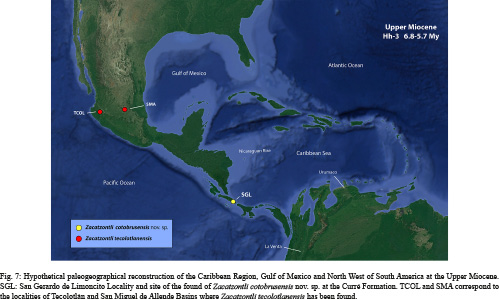 While the genus Zacatzontli appears to be currently be restricted to the late Hemphillian (Late Miocene) of Mexico and Costa Rica, its two species are not contemporaneous, as Zacatzontli tecolotlanensis is slightly younger at 4.95 Ma in age [Hh4] while the age of Zacatzontli cotobrusensis is 5.80 Ma and is late early Hemphillian in age [Hh3], and the older of the two species. Given the limited record of the genus the age difference between the two species may simply be reflective of the geographic distance between the two localities. An earlier record in the more southern locality in Costa Rica would be expected to document the earlier dispersal into Central America with an expected time lag for its subsequent dispersal northward into Mexico. Such a time lag may be another example of the “holding pen” model (sensu Woodburne, 2010), when a taxon occurs earlier in a given location, only to be found later in an adjacent area. But, as noted by Woodburne (2010), the degree to which Central America acted as a holding pen for any trans-isthmian dispersal remains an open question. Woodburne et al. (2006) observed that if the timing of the lapse between the first appearance of a taxon in Central America or Mexico and its subsequent presence farther north is accurate and pertinent, there must be some factor or factors retarding the dispersal northward from this southern region. In this case the factor may have been the separation of Costa Rica from northern Central America by a water barrier (Fig. 7) as indicated by the sedimentary unit from which the sloth was recovered, conglomeratic lenses within a subaquatic fan delta facies, indicative of inner neritic platforms to sub-littoral and estuarine coastal environments.
