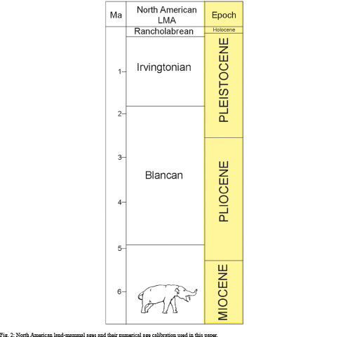 We assign ages to vertebrate fossils from Guatemala based primarily on the North American land-mammal “ages” (NALMAs), as characterized and correlated to the late Cenozoic epochs by Tedford et al. (2004) for the Miocene and by Bell et al. (2004) for the Pliocene-Recent. We use the redefinition of the Pleistocene, which lowers the Pleistocene base to about 2.6 Ma. Thus, the NALMAs relevant to the Guatemalan vertebrate fossil record are: (1) Hemphillian: Late Miocene-Early Pliocene, ~ 4.7-9.0 Ma; (2) Blancan: Early Pliocene-Early Pleistocene, ~1.8-4.7 Ma; (3) Irvingtonian: Early-Middle Pleistocene, ~ 200,000 years-1.8 Ma; and (4) Rancholabrean: Late Pleistocene, ~ 10,000-200,000 years (Fig. 2).