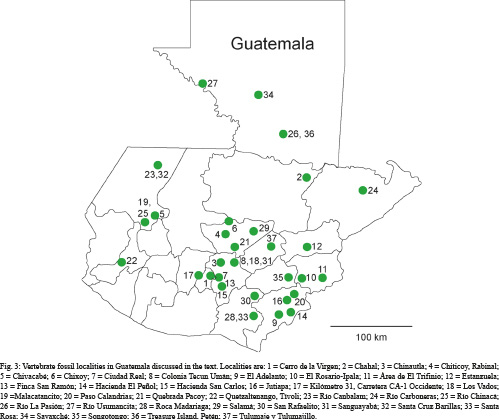 Colón (2015) presented the most detailed locality data available on these sites, and he also listed (p. 79-82) 24 more vertebrate fossil occurrences “sin lugar exacto” (without exact location) not listed here. Dávila et al. (2019) presented map coordinates and some geological context for some of the most prolific fossil-vertebrate sites in Guatemala.