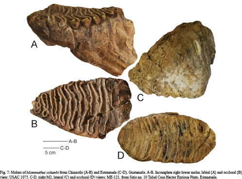 From the old city of Chinautla, McDonald & Dávila A (2017, fig. 6) documented an incomplete lower molar of Mammuthus columbi (Fig. 7A-B) that they say was found with fossils of Equus sp. and cf. Euceratherium sp. At Senahu II, in the vicinity of Chinautla, García & Ericastilla (1995) reported (without documentation) fossils of Eremotherium rusconii (= E. laurillardi: Cartelle & De Iuliis, 1995) and Cuvieronius hyodon. These are all late Pleistocene (Rancholabrean) records if the taxonomic identifications are correct. Mead et al. (2012) listed only a “gomphothere” as a valid record from Chinautla. Dávila et al. (2019) document specimens of Equus and Euceratherium from Chinautla. A late Pleistocene genus-level listing from Chinautla thus includes Cuvieronius, Equus, Eremotherium, Euceratherium and Mammuthus, though most of these taxa need further documentation and all are not from a single locality, so Chinautla is not listed in Table 1.