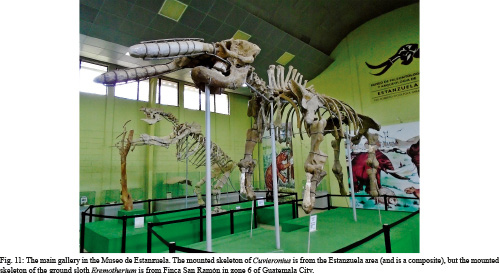Colón (2015) notes that Navarro (1856) first mentioned Zacapa as a vertebrate-fossil locality, claiming that fossil skeletons of “mastodontes” were collected there. Estanzuela, in the Departamento de Zacapa, is the richest and most diverse late Pleistocene mammal locality in Guatemala and the location of a museum with many Pleistocene mammal fossils on display (e.g. Gazin, 1965; Ibarra, 1980; Dávila et al., 2019; Table 1; Figs. 11-12). Barnum Brown first excavated at this late Pleistocene mammal locality with Jorge Ibarra in 1950. It was later collected by Brown and Gazin in 1955, Roberto Woolfolk and Bryan Patterson in 1971-1972, and subsequently by Woolfolk.
