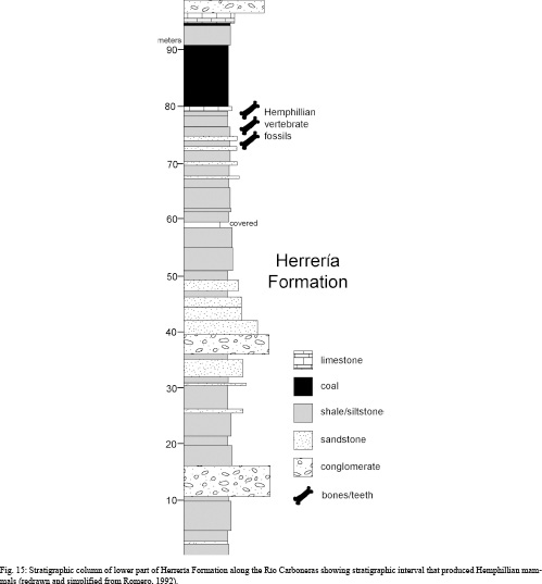 These Hemphillian mammal fossils are from an interval of the lower part of the Herrería Formation about 5 m thick (Fig. 15). They co-occur with fossils of fishes, turtles and crocodiles (Romero, 1992), and this important late Miocene locality merits further collecting.