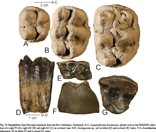 Mota-Vidaurre (1989; also see Madden & Mota-Vidaurre, 1989) reported on proboscidean cheek teeth from the Herrería Formation along the Río Carboneras in the Departamento de Izabal (also see Lucas & Alvarado, 1995 for detailed provenance) (Figs. 15-16). Lucas & Alvarado (1995) assigned these teeth (Fig. 16A-C) to “Rhynchotherium blicki”, and they suggested a Hemphillian age by correlation to the Gracias Formation in Honduras. However, these teeth are not diagnostic of Rhynchotherium and are a likely Hemphillian record of Gomphotherium hondurensis (Lucas & Morgan, 2008; Lucas & Alvarado, 2010).