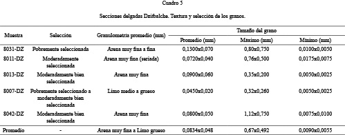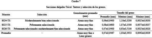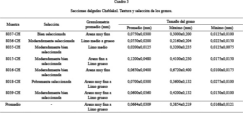 El estudio de los datos demuestra que esta tipología es característica por presentar una alta variabilidad (Cuadro 3, Fig. 4). El tamaño máximo del grano es arena media (0,672x0,40 mm). El tamaño mínimo de grano es arcilla media a limo medio (0,0075x0,0125 mm) y el tamaño de grano promedio va de limo medio a arena muy fina (0,0309x0,0664 mm).