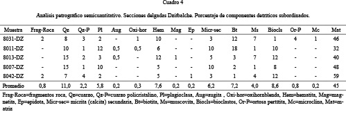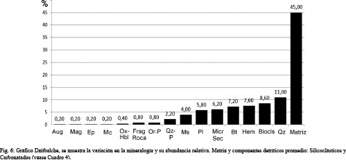 Los componentes detríticos de las muestras Dzitbalche son cuarzos, feldespatos (ortosa y plagioclasas), fragmentos de roca (esquistos), muscovita, biotita, hematita, oxihornblenda, magnetita y epidota. Se resalta que la muestra 8031-DZ (Isla Piedras) es una cerámica poco común dentro de toda la muestra (Cuadro 4), debido a su contenido de feldespato potásico y los fragmentos de roca.