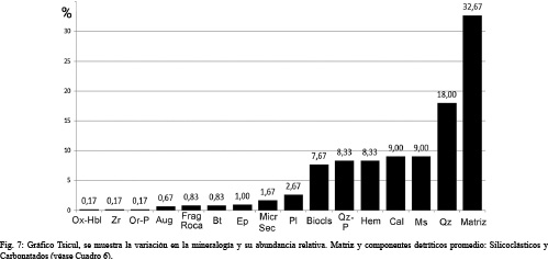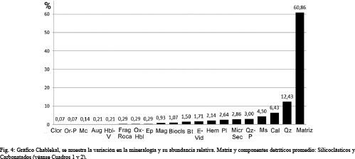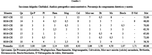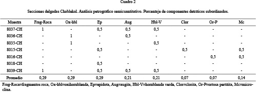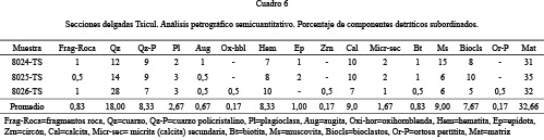 Los componentes silicoclásticos (Cuadros 1 y 2) son: cuarzo, plagioclasas, micas, óxidos de hierro como subordinados están fragmentos de roca, feldespatos de K, piroxenos, anfíboles, epidotas, cloritas y esquirlas de vidrio.
