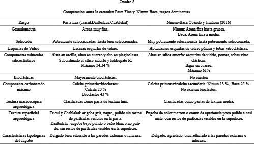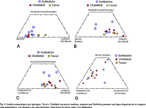 8) Hay que considerar que las razones de estas diferencias o similitudes petrográficas entre las pastas finas Dzitbalche, Tsicul y Chablekal podrían ser tanto de índole geológica como de conocimiento tecnológico en las opciones culturales, como por ejemplo formulación de la pasta.