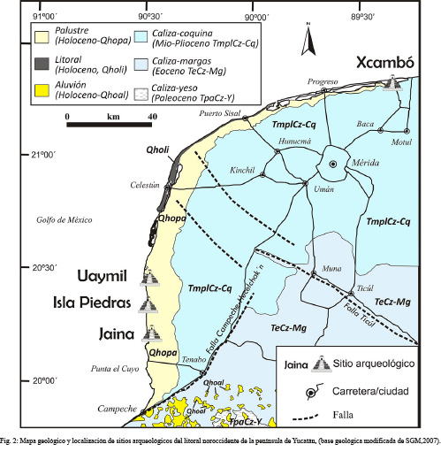 Geológicamente hablando, la Península de Yucatán está formada por rocas calizas (SGM, 2007). Las más antiguas se localizan al sur del área de estudio (Fig. 2), son calizas y yesos de edad Paleoceno (TpaCz-Y, Fig. 2). Las calizas y margas (arcillas calcáreas), de edad Eoceno (TeCz-Mg, Fig. 2), se presentan al sur de la península, las ciudades Ticúl y Muna se asientan sobre estas calizas. Las calizas y coquinas son las rocas mas distribuidas en la Península, de edad Mioceno al Plioceno (TmplCz-Cq, Fig. 2), la ciudad de Mérida se encuentra sobre estos depósitos, los cuales incluyen calizas cristalinas blanquecinas, coquinas, brechas calcáreas y conglomerados, se disponen de manera horizontal. Los depósitos recientes del Holoceno son depósitos palustres, marismas (SGM, 2007) , que se encuentran hacia el área litoral de la península, los sitios Uaymil, Isla Piedras, Jaina, se asientan sobre estos depósitos.