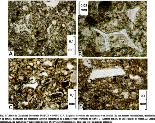 Las esquirlas de vidrio solo se han encontrado en dos preparados 8036-CH(Uaymil) y 8039-CH(Jaina) (Fig. 3, Cuadro 1), tienen una abundancia de 3 % a 9 %, es vidrio volcánico, no recristalizado, no meteorizado, muy transparente y de variadas formas, típicamente son angulares, con formas de yunques, tripoides, vesiculares finas a muy finas, usualmente con microfracturas. En la muestra 8036-CH(Uaymil), el tamaño máximo observado osciló entre 0,288 x 0,072 mm (arena media a muy fina) hasta 0,252x 0,084 mm (arena muy fina a media). Mientras que el preparado 8039-CH(Jaina), tiene esquirlas más finas de 0,06 x 0,006 mm (limo fino a grueso) hasta 0,18 x 0,072 mm (arena fina a muy fina).