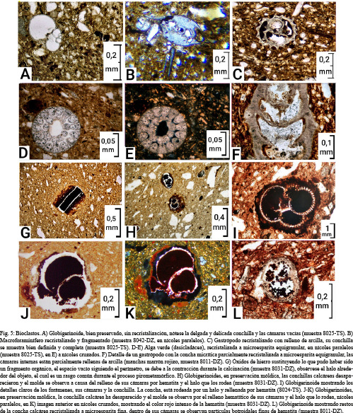 4) En los preparados, se observó una variada asociación bioclástica, estos microorganismos de origen marino son principalmente: bivalvos, gasterópodos, equinodermos, briozoos, algas, microforaminíferos (plantónicos y bentónicos) y macroforaminíferos, así como sus fragmentos. Mientras que los componentes silicoclásticos provienen del continente (entre ellos los fragmentos de rocas metamórficas).