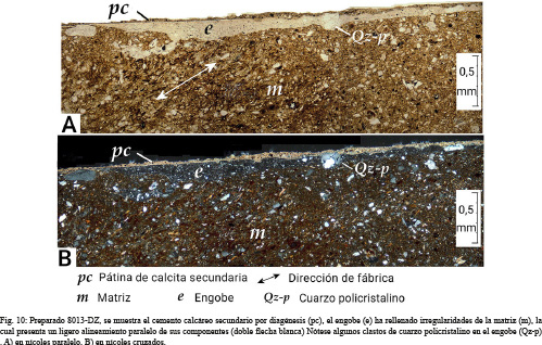 a) Como pátina de calcita secundaria formada por micrita-esparita, Por ejemplo, el preparado 8013-DZ, el cual presenta un mantillo continuo carbonatado que se extiende sobre el engobe a modo de cemento (Fig. 10), esto último endureció el fragmento cerámico. Por otra parte, las superficies de los fragmentos presentaran colores blanquecinos amarillentos de aspecto aparchonado por efecto del precipitado calcáreo.