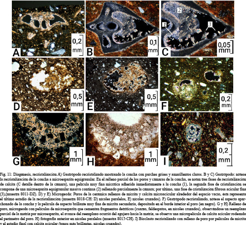 d) Neoformación de carbonatos, como microesparita granular, calcita acicular y de reemplazamiento (Fig. 11F, G, H, I).