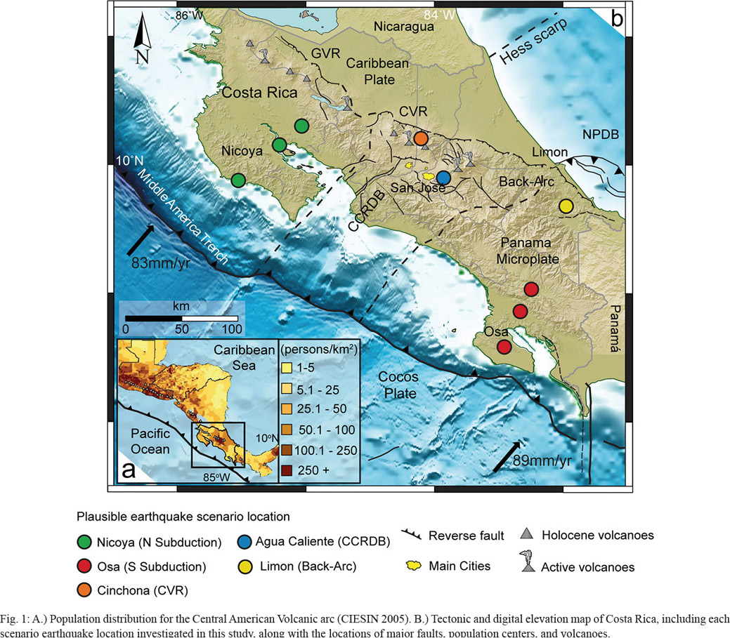 With its diverse tectonic environments and associated widespread seismic hazard, rugged topography, and extensive areas of high landslide susceptibility, Costa Rica offers an ideal environment for demonstrating the capability of scenario earthquakes to coseismic landslide risk assessment. We examine five environments to represent the range of hazard presented by the tectonic, climatic, and lithologic regions present in Costa Rica (Fig. 1). These include (1) subduction megathrust events along the Cocos-Caribbean plate boundary beneath the northern Nicoya peninsula and (2) the southern Osa peninsula, (3) intraplate events beneath the Central Volcanic Range (CVR) and (4) the Central Costa Rica Deformed Belt (CCRDB), and (5) back-arc thrust events on the eastern Caribbean coast of Costa Rica.
