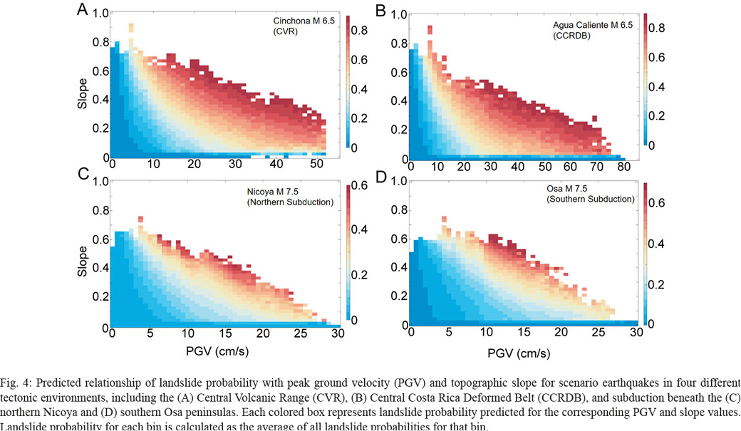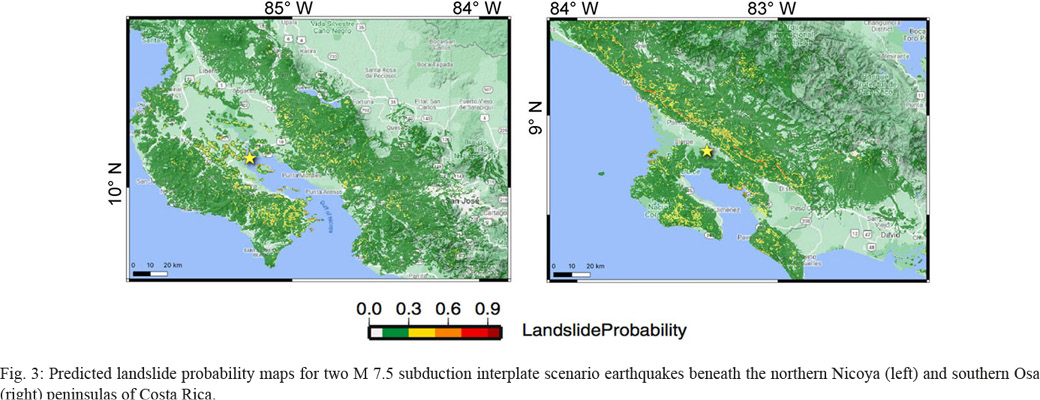 Large subduction megathrust earthquakes along the Cocos-Caribbean interface have potential to produce devastating impacts and widespread landsliding throughout Central America, prominently Costa Rica’s Pacific coast. Historical subduction seismicity has been concentrated beneath the northern (Nicoya) and southern (Osa) peninsulas (Ruiz et al., 2019; Tajima and Kikuchi, 1995; von Huene et al., 2000; Yue et al., 2013). We therefore choose to analyze scenario earthquakes along the Cocos-Caribbean plate interface of each region to elucidate the relative influence of earthquake source and geomorphologic factors on ground failure in Costa Rica. Both regions are especially vulnerable, due to their proximity to the plate boundary and rugged relief. In order to constrain physical controls on landslides triggered by subduction-related seismicity, we compare the relative influence of ground failure proxies, including topographic slope, peak ground velocity (PGV), and compound topographic index (CTI), on the predicted landslide probability distribution for five suites of scenario earthquakes (e.g., Fig. 2). The level and distribution of ground shaking caused by rupture on the subduction interface is highly dependent upon earthquake location, magnitude, and depth. Earthquake depth and location are closely linked by the geometry of the subduction interface and dictate whether the subduction interface ruptures offshore (beneath the Pacific Ocean) or beneath mainland Costa Rica. This in turn controls shaking intensity and severity of impacts to population. Example landslide probability maps for M 7.5 subduction earthquake scenarios at 40 km depth beneath the Nicoya and Osa peninsulas are shown in Figure 3.