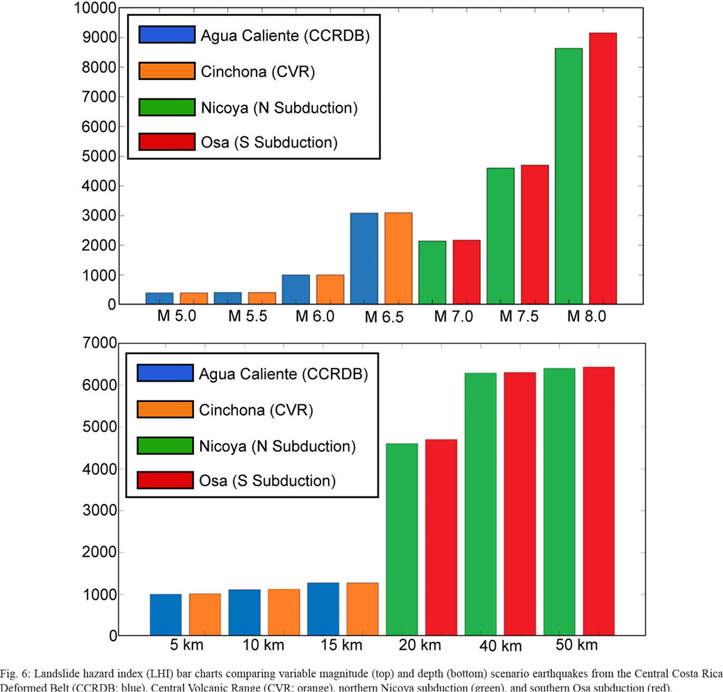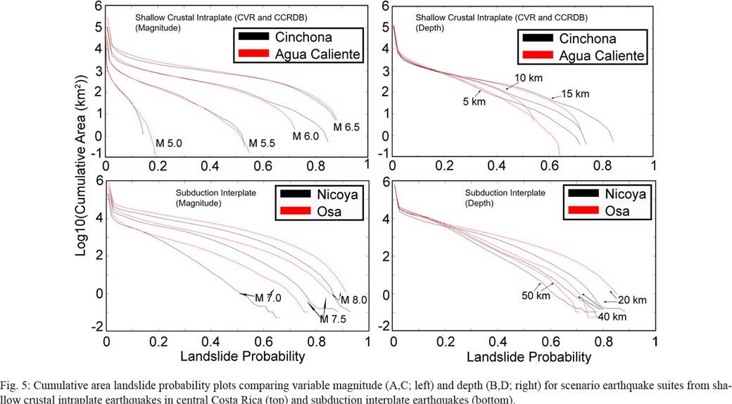 Here we investigate the influence of earthquake source parameters on ground failure, varying earthquake magnitude and depth for suites of scenario earthquakes at two locations in the CVR and CCRDB. Each of these two shallow intraplate scenario earthquake suites includes M 5.0, M 5.5, M 6.0, and M 6.5 at 5 km depth, as well as M 6.5 events at 10 km and 15 km depth. For both suites of earthquakes, we find, not surprisingly, that magnitude is the primary control on the distribution of predicted landslide probability. Increasing earthquake magnitude always results in larger areas affected by each respective landslide probability value, as well as higher maximum landslide probability and LHI values (Fig. 5). Of these two intraplate suites, the Cinchona events always produce a significantly higher maximum landslide probability than the corresponding Agua Caliente scenario, while LHI is nearly identical and only marginally higher for Cinchona (Fig. 6).