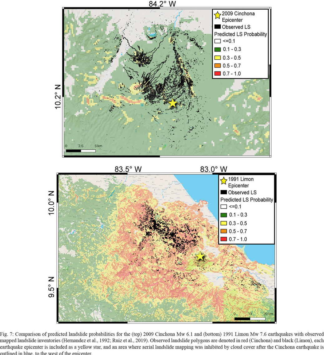 As the Nowicki Jessee et al. (2018) landslide model is based on global data, it is crucial that the model predictions are grounded in local observational data from Costa Rica. In this study, we use mapped landslide inventories from the 2009 Cinchona Ww 6.1 and 1991 Limon Ww 7.6 earthquake to validate model predictions in the regional geophysical context of the CVR and back-arc thrust systems of Costa Rica. We compare the observed mapped landslide polygons of each inventory with predicted landslide probability distributions (Fig 7). For both inventories, we find that landslide observations fit the model predictions well, with landslides generally occurring in areas of high landslide probability, above ~30%. Detailed statistical discussion of model validation for these two events can be found in the discussion.