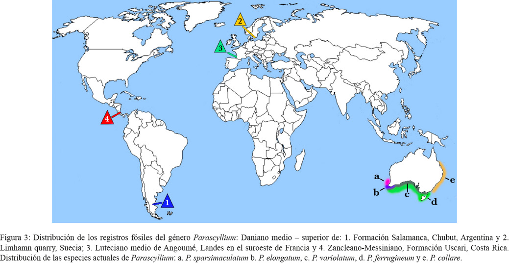 Durante el Paleógeno la distribución del género Parascyllium fue mucho más amplia, registrándose por ejemplo en el Paleoceno temprano de la provincia de Chubut, Argentina en la Formación Salamanca (Bernárdez Rodríguez, 1997) y el Paleoceno temprano de Suecia (Siverson, 1993); desafortunadamente en ninguna de estas publicaciones se ilustran los ejemplares. Por su parte, Adnet (2006) registra Parascyllium sp. en el Lutetiano, Eoceno medio, del suroeste de Francia (Cappetta, 2012, fig. 151, pág.164) (ver figura 3).