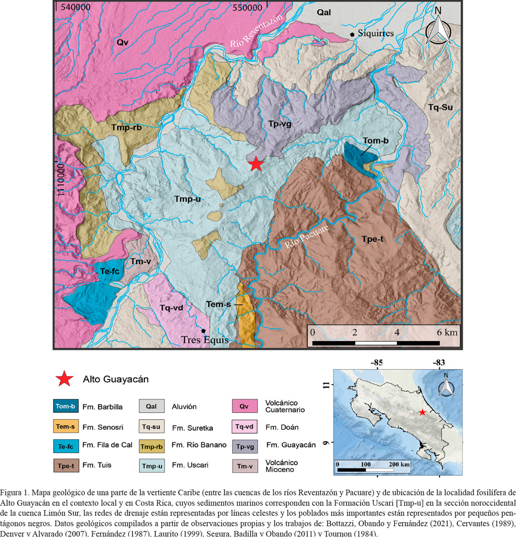 Los ejemplares proceden de la localidad fosilífera de Alto Guayacán, 8 km al suroeste de la ciudad de Siquirres. Estratigráficamente fueron recolectados en la Formación Uscari, en una de sus secciones más jóvenes con una edad Mioceno Superior cuspidal – Plioceno Inferior basal equivalentes a las biozonas N17, N18 y N19 de foraminíferos planctónicos, correspondientes con las épocas Messiniano-Zancleano (Figura 1).