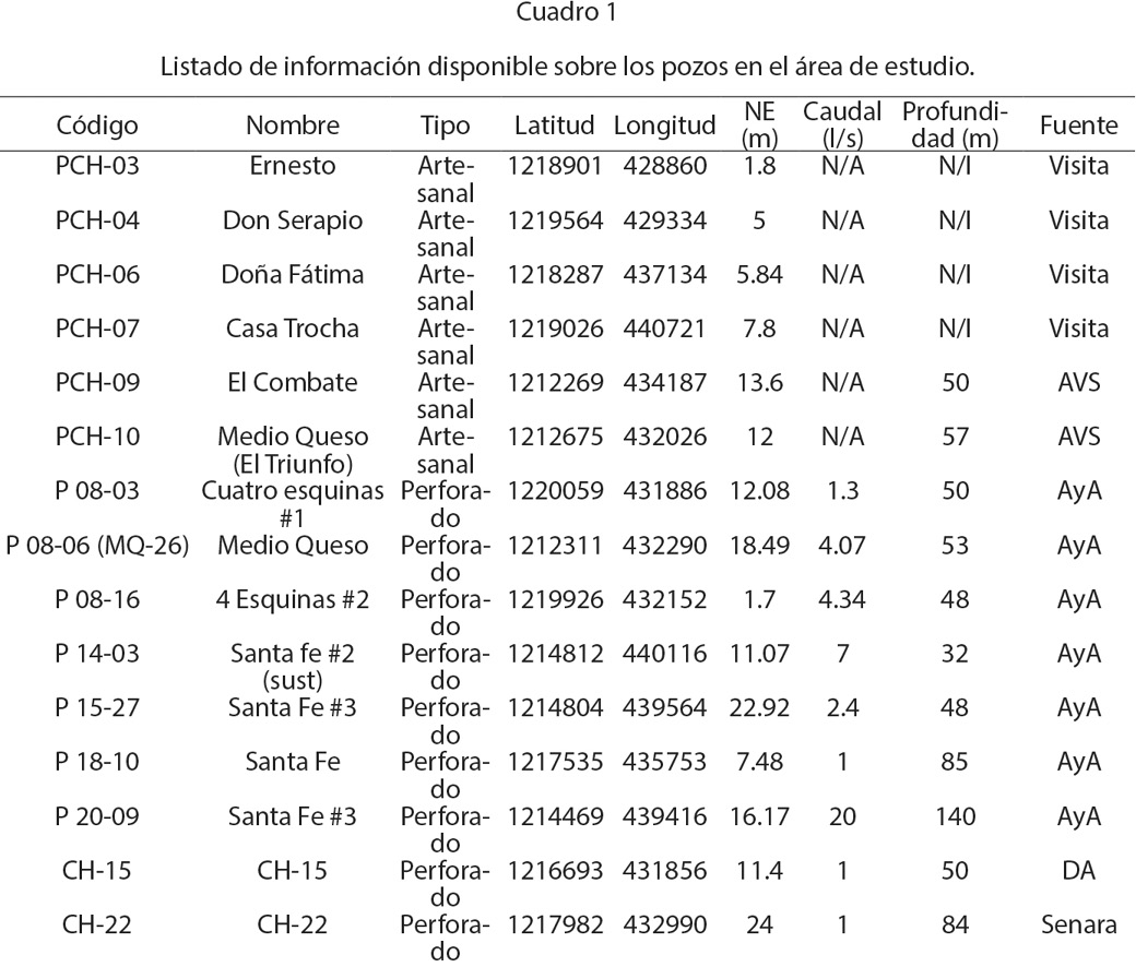 Para el contexto regional, se revisó información de pozos de las distintas bases de datos del país, en las comunidades de Isla Chica, La Trocha y regiones aledañas como Santa Fe, Medio Queso, El Triunfo, entre otros. Los datos recopilados se resumen en el cuadro 1. La información en este cuadro se organizó para separar los pozos artesanales y perforados.