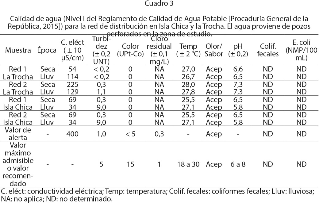 En cuanto a la calidad de agua en la red de distribución, tanto en época seca como lluviosa, se cumplen los parámetros de Nivel 1 (Cuadro 3), exceptuando el valor obtenido para el parámetro de turbidez en época lluviosa en la Red de Isla Chica. Este dato podría ser un resultado de ese muestreo particular, se recomienda realizar muestreos periódicos para observar si los análisis de turbidez generan resultados similares. El pH de dos muestras de la red de distribución en Isla Chica, durante la época lluviosa, presentan un valor de 5,8, lo que se considera ácido, sin embargo, no es posible con tan pocos datos, ofrecer una explicación adecuada a este valor.