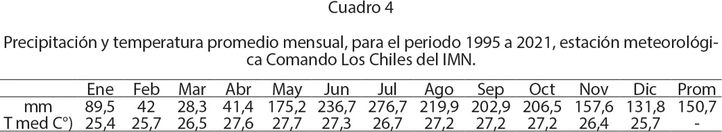 Los datos de precipitación provienen de la estación meteorológica del IMN, Comando Los Chiles, se muestran en el cuadro 4, se muestra que los meses de enero a abril corresponden a la época seca y los meses de mayo a diciembre corresponden a datos de época lluviosa.
