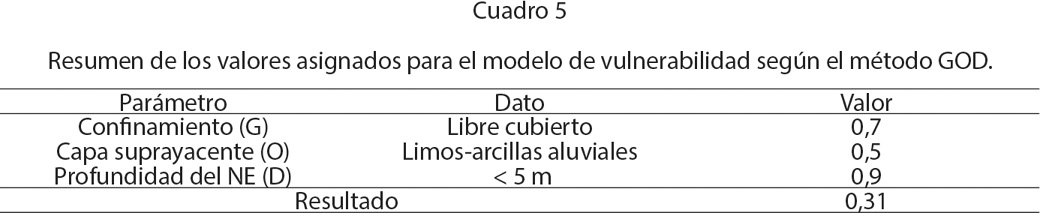 Se utilizó el método GOD (Foster et al., 2002), modificada para su uso en nuestro país por Ramírez (2013), que utiliza como parámetros base el grado de confinamiento hidráulico del acuífero (G), el tipo de litología que cubre el acuífero (O) y la profundidad en que se ubica el nivel de saturación de agua (D). El análisis se realiza para el acuífero superficial, que se interpretó como un acuífero somero, libre, cubierto. En el cuadro 5 se resumen los parámetros asignados al modelo de vulnerabilidad (GOD).