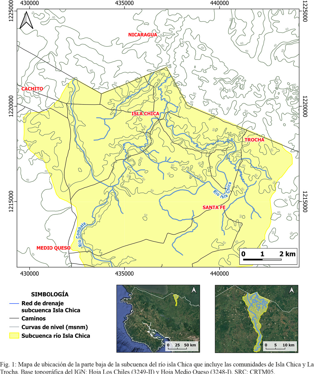La microcuenca del río Isla Chica, afluente del río San Juan, administrativamente se localiza en el distrito fronterizo de Los Chiles, cantón de Los Chiles, provincia de Alajuela, entre las coordenadas 1198000 – 1226000 Norte y 416000 – 450000 Este de Transversal Mercator para Costa Rica (CRTM05), en las hojas topográficas de Medio Queso (3248-I) y Los Chiles (3249-II) del Instituto Geográfico Nacional (IGN), escala 1:50 000. En la figura 1 se muestra esta subcuenca. El área de estudio abarca aproximadamente 93 km² y se circunscribe a la parte baja de la subcuenca del río Isla Chica, cuyos límites son: al norte con Nicaragua, al sur con el poblado de Medio Queso, al este con el sector conocido como Las Delicias y al oeste con las comunidades de Cachito, Primavera y Finca Berlín.