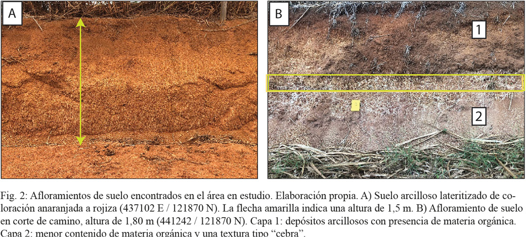 Debido a que no se encontraron afloramientos rocosos en el área de estudio, para interpretar la geología local en la zona, se visitaron algunas secciones de ríos o cortes de caminos. La figura 2 muestra dos de los afloramientos de la zona de estudio.