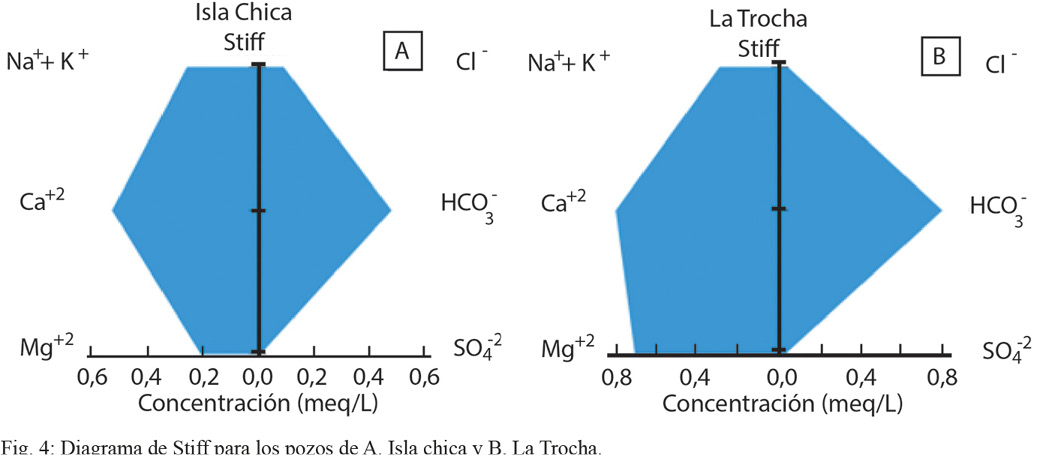 El agua de los pozos de Isla Chica y la Trocha es de tipo bicarbonatado-cálcico. El diagrama de Stiff de la figura 4 muestra la distribución de iones mayores para estos dos pozos.