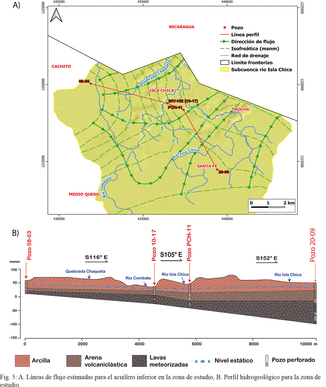 En la figura 5A se ilustra la ubicación de los pozos y las isofreáticas calculadas para el acuífero, así como la ubicación espacial del perfil hidrogeológico esquemático (Fig. 5B) generado a partir de las descripciones litológicas de los pozos: 08-16 (Cuatro Esquinas #2 - AyA), 10-17 (Isla Chica #2 - AyA), PCH-11 (Isla Chica 2 - AVS) y 20-09 (Santa Fe #3 - AyA).