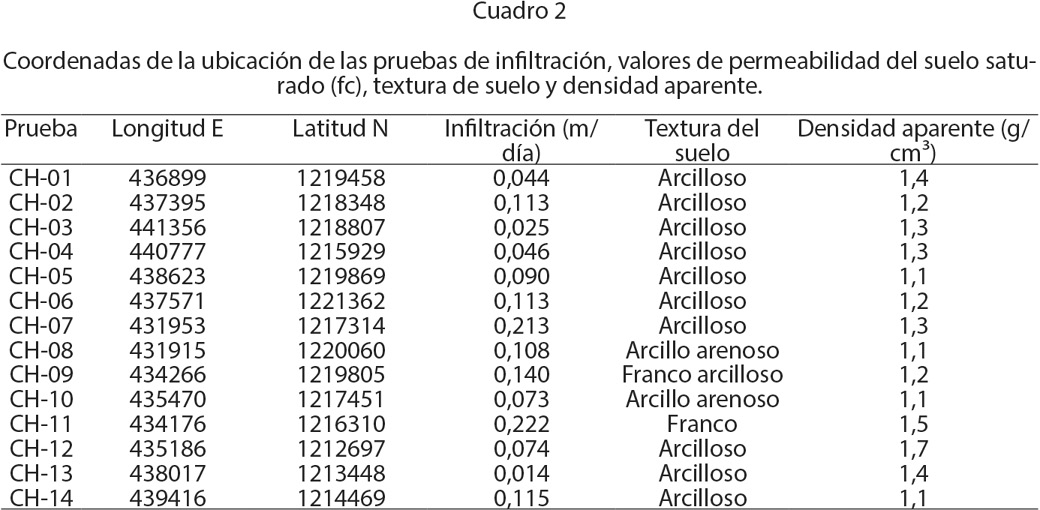 Las 14 pruebas de infiltración realizadas se distribuyeron según se observa en la figura 3, a partir de las características morfológicas y pedológicas de la zona. Las pruebas ejecutadas muestran valores de infiltración básica del suelo (fc) para la zona no saturada entre 0,014 y 0,22 m/día, lo que se relaciona con un suelo arcillo-arenoso, lo que concuerda con los resultados de los análisis de textura.