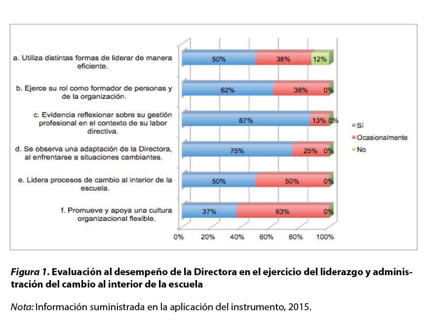 Según la apreciación de las participantes y tal como se muestra en la Figura 1, la directora no estaría liderando a cabalidad los procesos de cambio dentro de la escuela. Esta opinión puede relacionarse con la débil adaptación de su liderazgo en las diferentes situaciones cotidianas donde se desempeña. Para el Ministerio de Educación (2005), un buen liderazgo podría asumir diferentes caras, las que responden a las necesidades que tenga en un momento u otro el centro educativo. Esta situación se puede asociar a la baja evaluación positiva en su tarea de promover y apoyar una cultura organizacional flexible, que se adapte a los diferentes cambios internos y del entorno.
