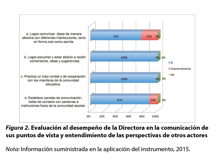 Como aspecto a optimizar, se observan en la Figura 2, la comunicación efectiva de la directora, base para un buen liderazgo. Este es un elemento clave a trabajar, al asumir que cualquier proceso de mejoramiento a emprender requiere de buena comunicación, tanto al interior de la comunidad educativo como en su relación con el medio. El Ministerio de Educación (2005) manifiesta que los líderes deben asegurar canales efectivos de comunicación para que sus mensajes sean entendidos y los diferentes miembros de comunidad se sientan escuchados.